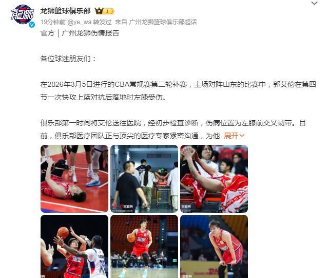 广州男篮官方伤情报告写道:“俱乐部第一时间将(郭)艾伦送往医院,经初步检查诊断,伤病位置为左膝前交叉韧带。目前俱乐部医疗团队正与顶尖的医疗专家紧密沟通,为他制定后续康复方案,我们将确保艾伦获得最好的康复治疗。”